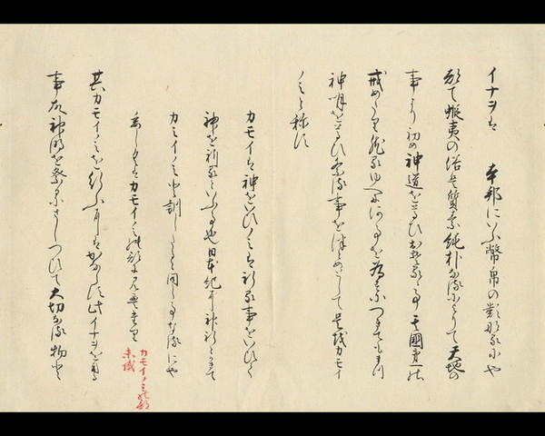 イナヲとは、わが国でいう幣帛の一種のことと考えられる。「蝦夷」の風俗は、概ねにおいて質素純朴である。彼らの国の開闢以来一番の戒めとして、神道を尊び畏怖することを挙げているほどだ。従って、何事をするにつけても、まず神明を尊び祭ることを旨としており、それをカモイノミと称している。
