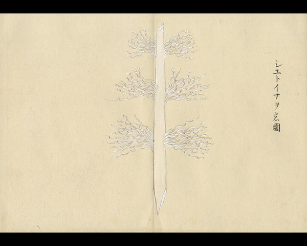 * ウカルといって、アイヌの人々のなかで俗罪を犯した者がいた場合、その者を鞭打つことがある。シユトは、その際に用いられる杖のことをいう。詳しくは、本稿「ウカルの部」に記してある。このイナヲを作製するときに、まず木をシユトの形のように加工してから順次削っていくことにより、こう名づけられたのである。わが国の言葉で罪人を打つ杖のことを「しもと」という。つまり、「シユト」は「しもと」の転語であり、これまたわが国の言葉と通じていることになろう。なお、このイナヲはどの神を祈るにも共通して用いられるものである。