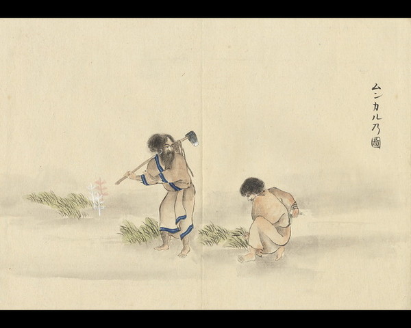 これも、初めに記したムンカルと同様、草を刈るという言葉である。しかし、その意味内容は異なっている。前に記したものは、ただ草を刈ることをいうのみであった。ここでいうムンカルは、蒔いて置いた二種の作物が発芽し、丈もやや伸びた頃に、その間に交じって生えてきて成長の妨げとなる雑草を取り除く作業をいう。従って同じく草を除くという言葉ではあるが、その意味するところは異なっているのである。これは、前述のように、アイヌの人々の言葉は単語の数が少なく、物事を兼ねていうことがあるためである。いま述べた二つの作業について、同じくムンカルと称するのは、そのためである。