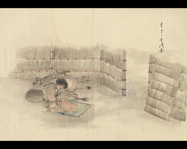 イトヽイの図 是は舂く事終りてより、箕をもて簸さ まなり、イトヽイとは簸事をいふ、 この図は、搗く作業を終えてから、箕を用いて籾殻をあおり屑を取り除いている様子である。イトトイとは、箕を用いて籾殻をあおり屑を取り除くことを意味する。 ← 前ページへ | 次ページへ →
