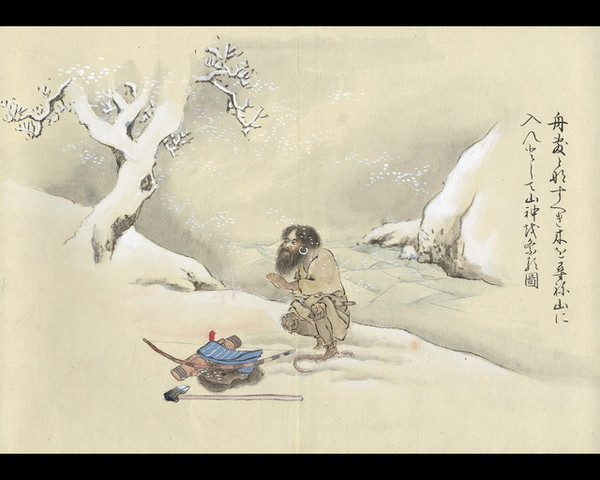 舟敷となすへき木を尋ね山に入んとして山神を祭る図