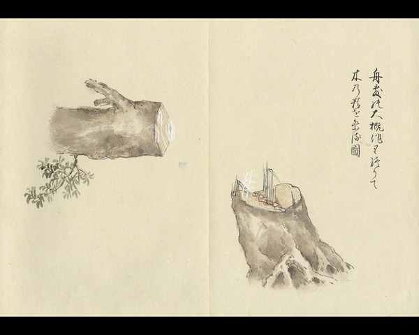☆ 船体のおおよそを造り終わってから、その伐りとった木の株と梢にイナウを捧げて木の霊をお祭りすることは図にしめしたとおりである。その祈りことばは「チクニヒリカノヌウハニチツフカモイキヤツカイウエンアンベイシヤムヒリカノイカシコレ」と唱えるのである。その意味はチクニは木のことをいい、ヒリカはよくということ、ヌウハニは聞けということ、チツフは舟のことをいい、カモイは神をいい、キはするといい、ヤツカイはよってということ、ウエンアンベは悪いことをいい、イシヤムは無いということ、ヒリカは上と同じ、イカシは守護をいい、コレはしてくださいということであって、「木よ、よく聞いてください。あなたを舟の神とするので、悪いことが
