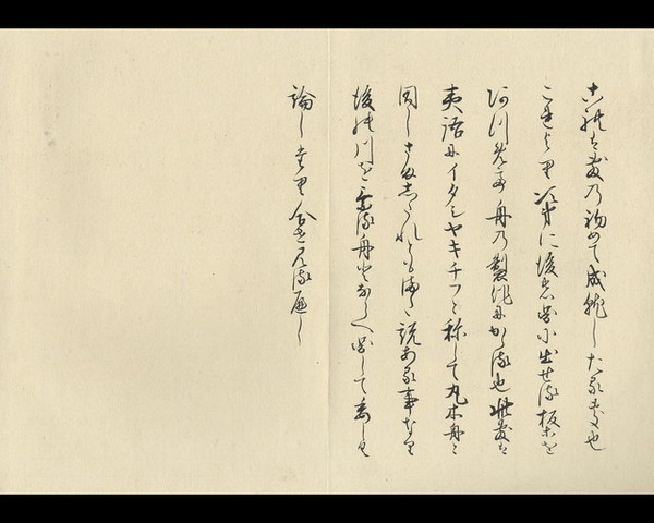 これは船体がはじめてできあがったところである。これからだんだんあとのほうの図で示したいたなどを集めて舟の製作に取りかかるのである。船体はアイヌ語でイタシヤキチフといって、丸木舟と同じ形をしているけれども、さらに説明することがある。のちに川舟とともに図示して詳しく説明してあるのであわせて見てほしい。