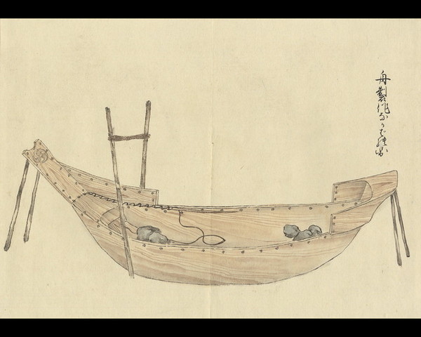 テシカに三種類あって、ひとつはニベシという。木の皮を剥いで縄に作って用いる。ひとつは桜の皮を剥いでそのまま使う。いまひとつは鯨の髭を剥いでそのまま用いる。いずれも図で見てほしい。三種類のうち、鯨のひげはビロウからクナシリまでの舟で多く使用される。シリキシナイからビロウまでの地方は鯨を捕ることがあまりないので、使用するテシカの多くは桜とニベシの皮である。