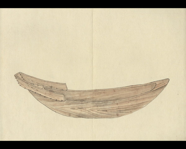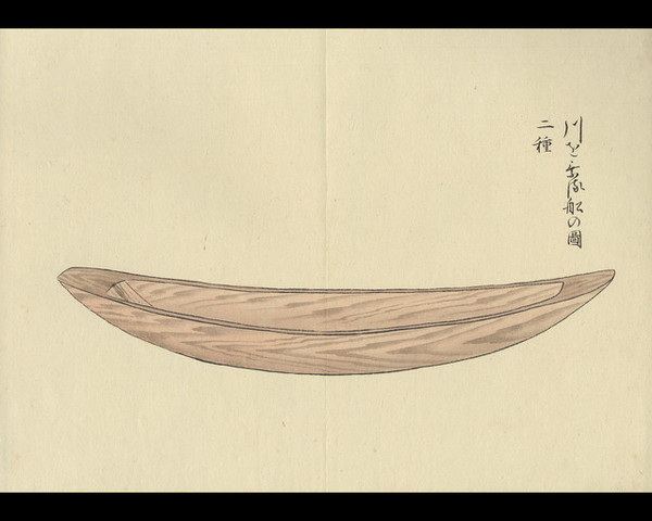 これは俗にいふ丸木舟のことである。製作する方法はイタシヤキチプとことなることはない。形が少しく違っていることは、図を見て考えてほしい。二種類の中、前の図は流が緩い川ならひに沼などで乗る舟である。後の図は急流の川で乗ったり、または川にとくに高低があって、水が落ること飛泉のようなところをさかのぼることなどがある時、舟に水が入らないようにするために、舳に板を綴じつけたところである。