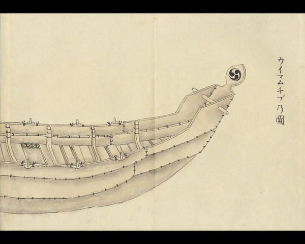 蝦夷の地、松前氏が領していた間、場所場所のヲトナと称するものは、その身一代のうち、一度は松前の殿様に目見えに出て、貢物を献上するのである。その貢物を積む舟をウイマムチプという。その作り方は普通の舟とかわっていることは図を見ればわかるだろう。ウイマムというのは官長の人(役人のおさ)に初めてお目にかかることをいう。