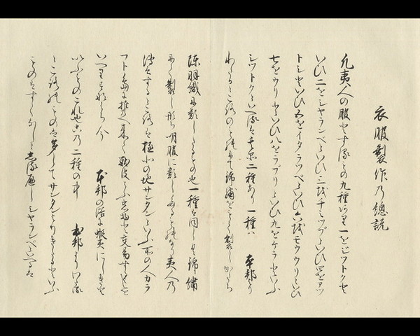 ☆一般にアイヌの人びとが衣服としているものに九種類ある。一はジツトク、二はシヤランベ【サランペ:saranpe/絹】、三はチミツプ【チミ*プ:cimip/衣服】、四はアツトシ【アットゥ*シ:attus/木の内皮を使った衣服】、五はイタラツペ【レタ*ラペ?:retarpe?/イラクサ製の衣服】、六はモウウリ【モウ*ル:mour/女性の肌着】、七はウリ【ウ*ル:ur/毛皮の衣服】、八はラプリ【ラプ*ル:rapur/鳥の羽の衣服】、そして九はケラ【ケラ:kera/草の上着】である。