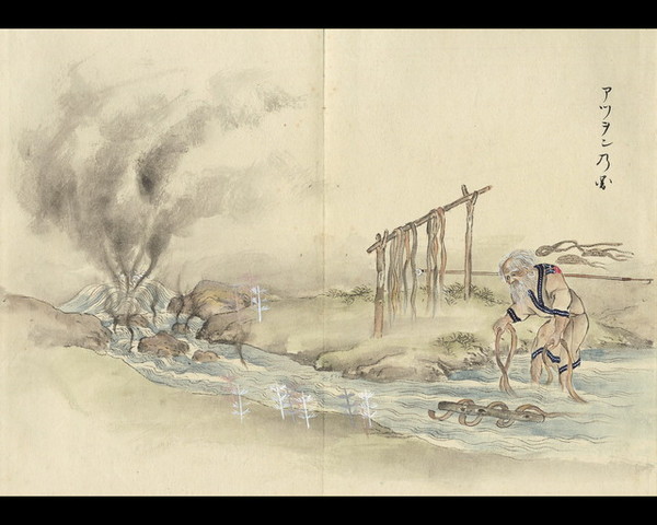 此図は剥来りしヲビウの皮を糸になさんとして、先温泉に