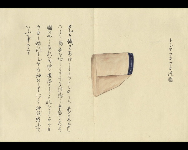 トシヤウカウカの図 是は織りあけたるアツトシのうち、前にしるせし ことく身衣を切りとりて、その残りたるところにて 図の如くなる筒袖を造るなり、これをトシヤウカ ウカと称す、トシヤは袖の事にて、袖を縫ふと いふ事なり、 ← 前ページへ | 次ページへ →