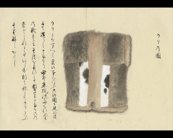 ウリの図 ウリとは、すへて裘の事をいふ、この図は熊の皮 にて造りしさまなり、此外、鹿・狐のたくひ、いつれ の獣にても其皮を用ひて製せるさまはこの 裘とことなる事あらす、都て称してウリといふ、 其義解しかたし、 ← 前ページへ | 次ページへ →